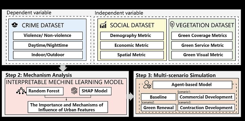 Urban environmental safety is critical for sustainable city development, yet the complex mechanisms underlying crime patterns pose significant research challenges. This study analyzes 12,893 criminal judgments (PCJs) from three Chinese megacities over three years using Large Language Models (LLM), developing a crime pattern simulation model that integrates Interpretable Machine Learning (IML) with Agent-Based Modeling (ABM). Then, three urban renewal scenarios were tested. The result shows that: (1) Socioeconomic and built-environment factors account for 33.3%-44.5% of outdoor crime spatial variation; (2) Nighttime lighting emerges as a key predictor, while canopy cover exhibits threshold effects on specific crime types; (3) Green regeneration scenarios demonstrate significantly lower crime rates. The proposed multidimensional framework provides actionable spatial planning insights and policy recommendations for safer cities.